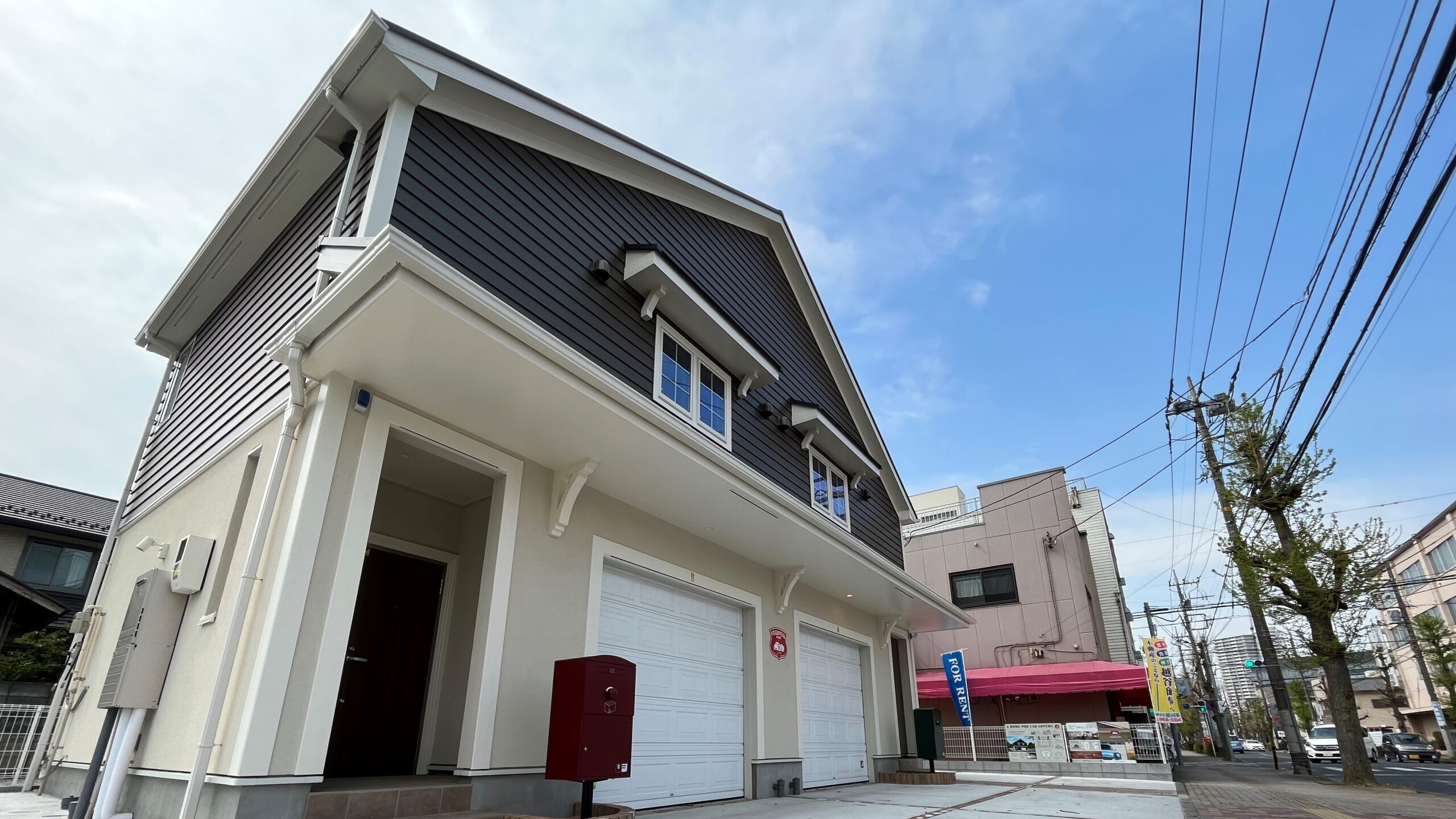 アメリカでもっともスタンダードなラップサイディングの壁と三角屋根を採用した外観デザイン。輸入住宅ならではのこだわりを持った本格派デザインです。左右振分の全2邸で、それぞれが、屋外に3台、ガレージ内に1台の最大4台を駐車することができます。