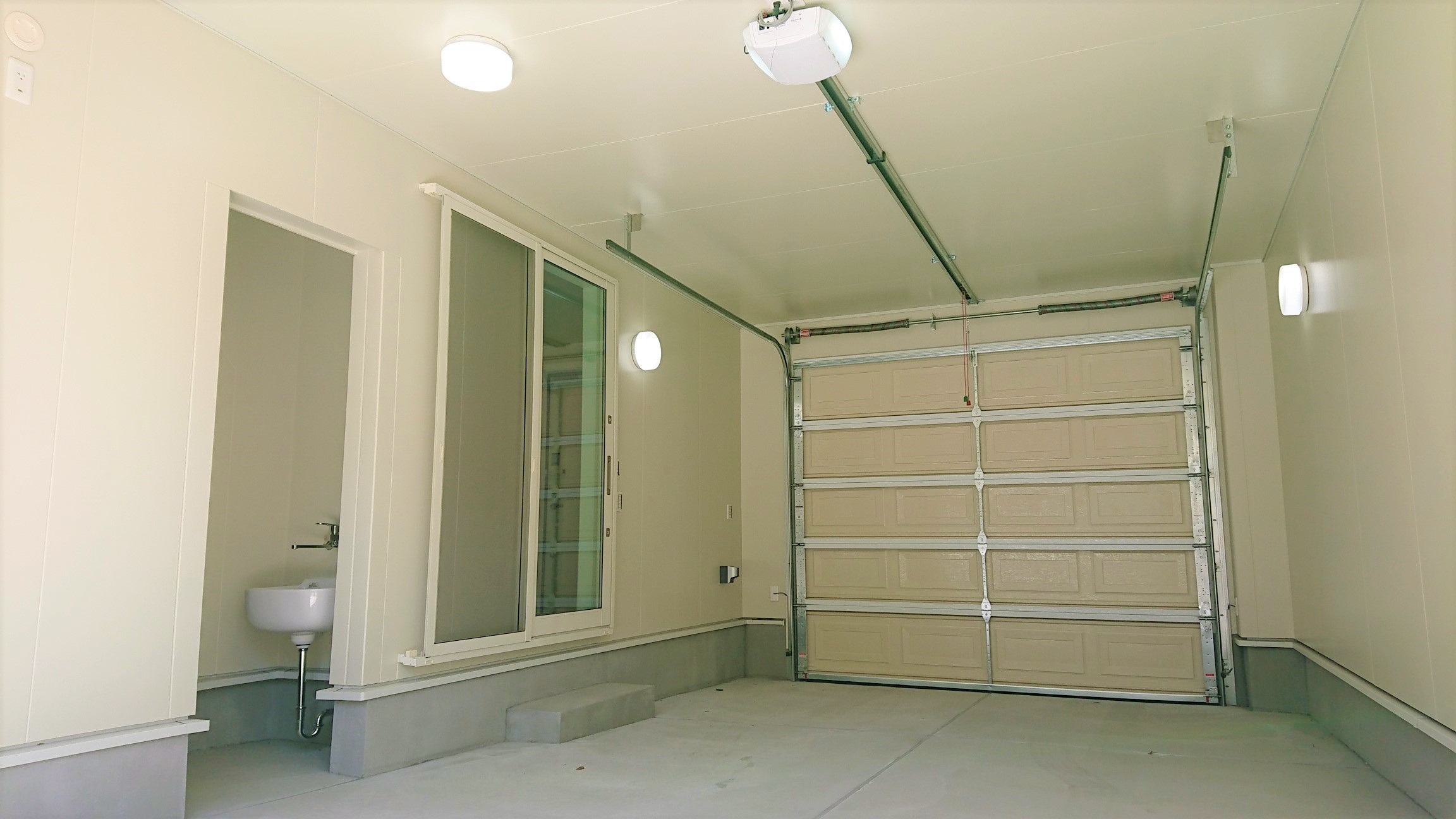 ガレージのシャッターを前後両方に設置しています。奥のシャッターは手動式ですが、手前のシャッターはリモコン電動シャッターで、光電センサ(安全装置)も付いているので安心です。ガレージ内にはEV車対応充電コンセント・スロップシンクもあります。
