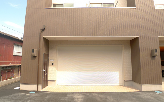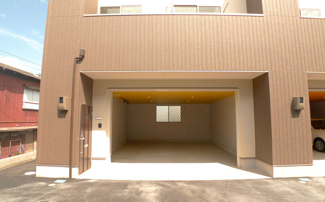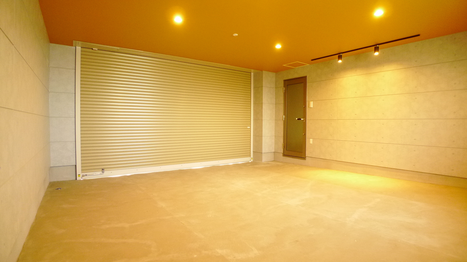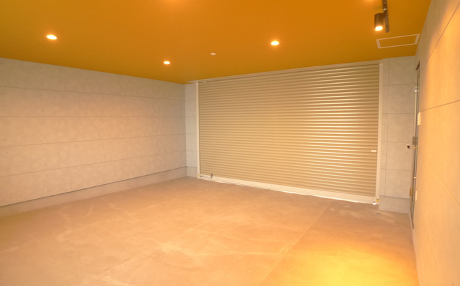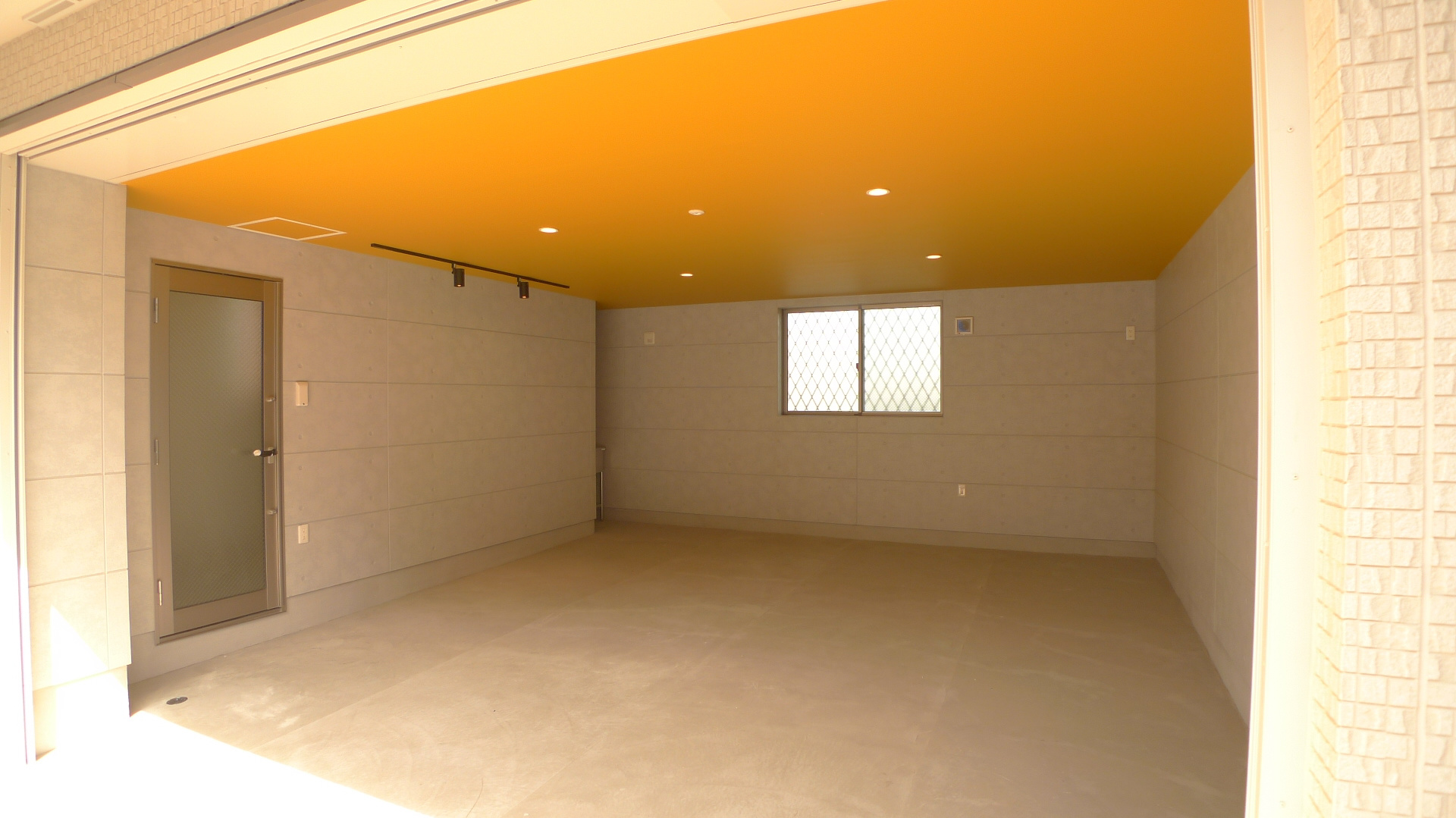 外観の落ち着いたアースカラーに対し、ガレージ内部は天井がポップなオレンジです。ヨーロピアンテイストな雰囲気を感じられます。オレンジの天井から発せられるダウンライトの光があなたの愛車の光沢をより艶やかに見せてくれそうです。